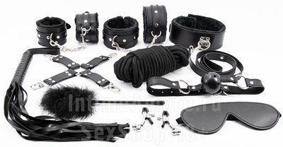 Черный БДСМ набор 10 предметов, экокожа и мех